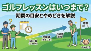 練習 ゴルフレッスンはいつまで?期間の目安とやめどきを解説 「ゴルフレッスンはいつまで続ければいい?」と悩んでいませんか。この記事では、初心者が100切りを達成するまでの期間の目安から、効果的な練習頻度、そして後悔しない上手なやめどきまでを具体的に解説します。あなたのゴルフレッスンはいつまで必要か、最適な答えが見つかります。 2026.01.30 練習